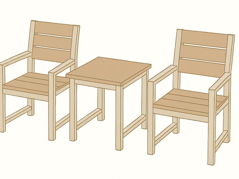 Сиденья стульев изготовлены из доски размером 100×40 мм, а спинки — из доски 100×30 мм. Столешницы столов и полки выполнены из влагостойкой ламинированной фанеры толщиной 9 мм, что позволяет использовать мебель в условиях переменчивой погоды. Все деревянные поверхности обработаны специальным атмосферостойким покрытием для защиты от влаги и солнечных лучей.
