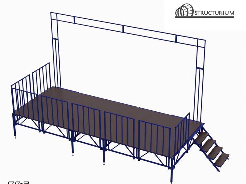 При производстве Подиума используется профильная труба 50*50*3мм, 50*25*2мм, 40*25*2мм, 25*25*2мм. Металлокаркас под баннер выполнен из профиля 40*25*2мм и 25*25*2мм. Перила выполнены из профиля 40*25*2мм и 25*25*2мм. Панели пола изготавливаются из влагостойкой ламинированной фанеры 21мм с антискользящим покрытием. Покраска полимерная порошковая с предварительным нанесением цинкосодержащего грунта, цвет синий.